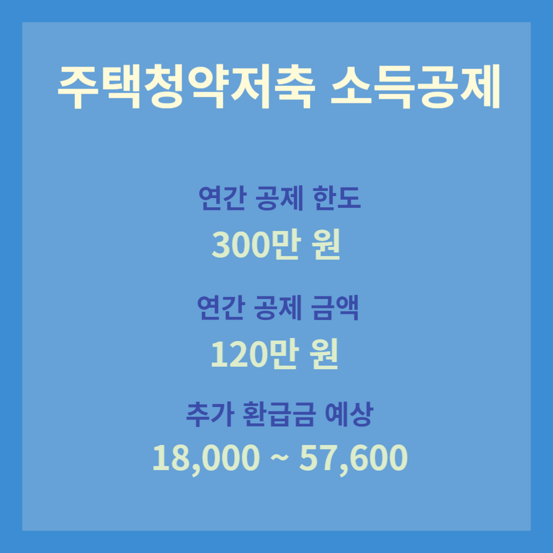 주택청약저축으로 인한 한 해 소득 공제 한도는 "연 300만 원" 그리고 공제 금액은 최대 "120만 원"이 됩니다.