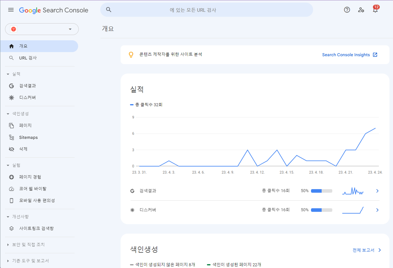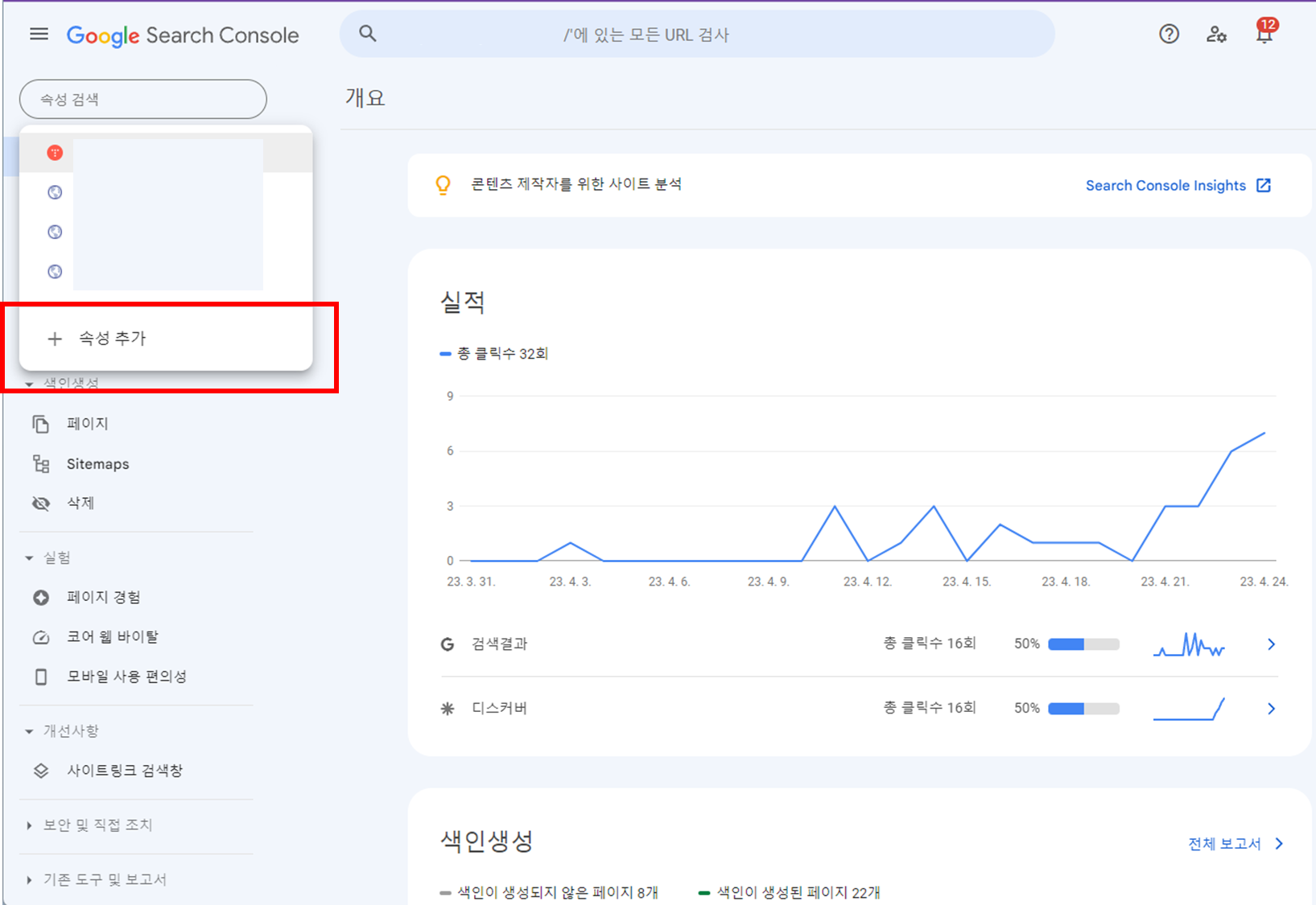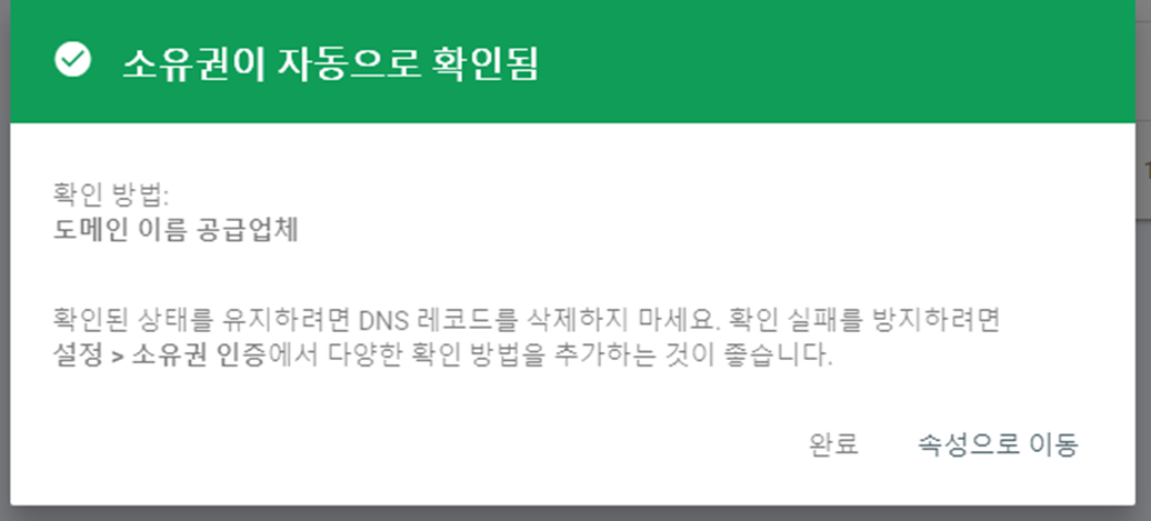 이전 구글 서치 콘솔로 돌아와 이전 팝업에서 확인 버튼을 선택하면 소유권이 확인됩니다.